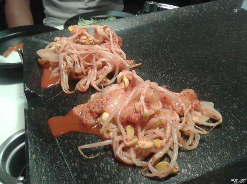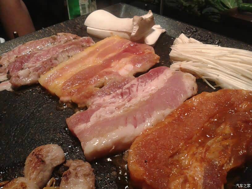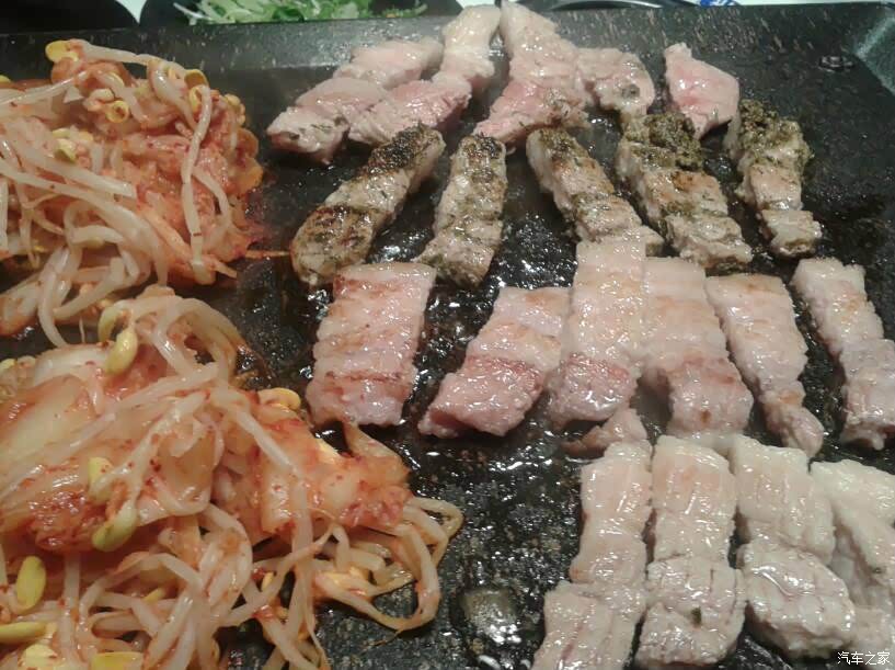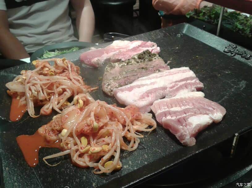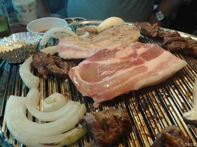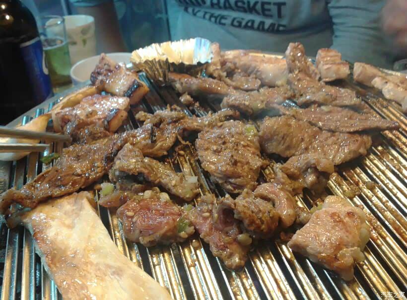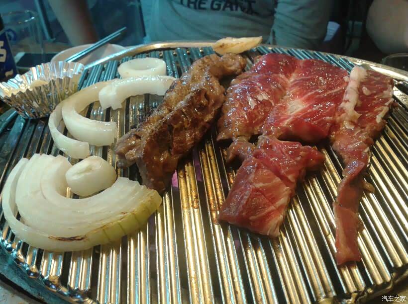 开烤了! 新鲜的牛肉、五花肉放在铁板上,嗤嗤作响。 韩国烤肉在烧烤时,铁板、烤架上是不刷油的, 肉就直接放在铁板、烤架上烤。 对于韩国人来说, 各种油料都是不太健康的食品。