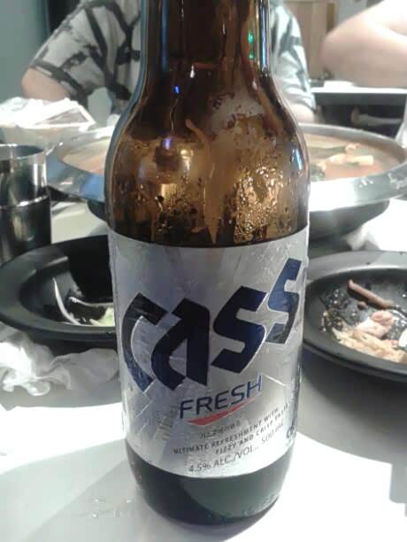 喝到兴头, 再来点韩国的啤酒。 听导游说:在韩国, 如果你一个人在餐馆喝酒, 是要被别人笑话的,为什么勒? 只能说明你没有朋友,所以在韩国, 小餐馆里都是四五成群的人一起喝酒、吃烤肉、聊天。