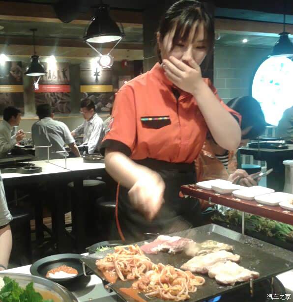 烤肉的时候, 不用客人动手, 服务员会帮客人翻烤的。这位美女服务员看到我在拍她, 不好意思地用手挡住自己的脸。