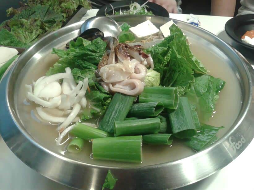 哇噻! 还有海鲜汤锅,一会吃烤肉可以喝点汤。