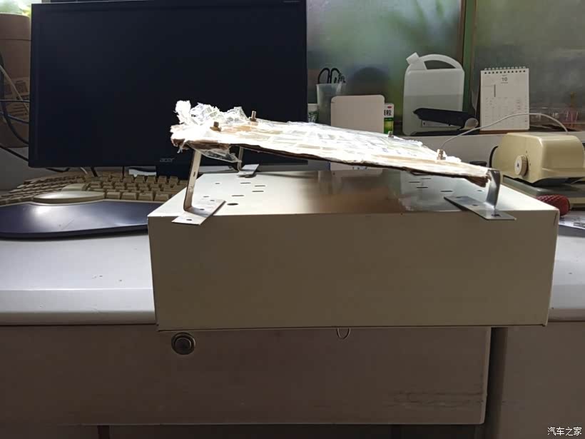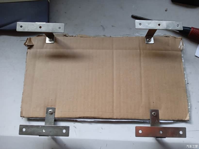 量好尺寸,用纸板模拟下发动机盖,因机盖上螺孔并不在一个平面而且还是承梯形,这样可以在箱子上提前打好安装孔。