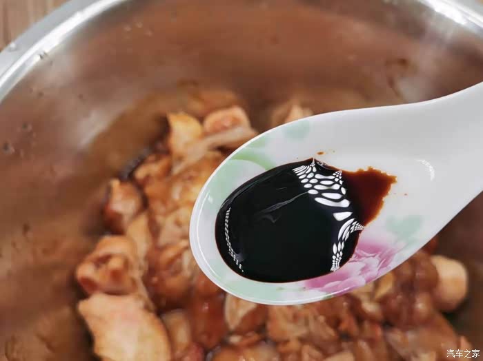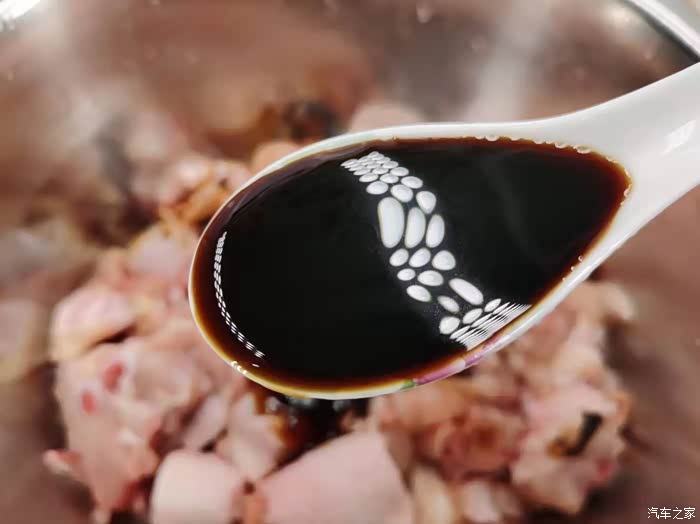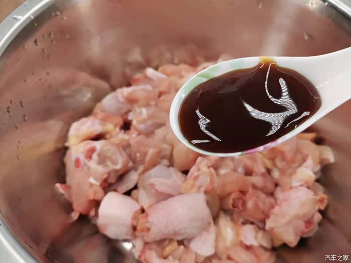 抓拌均匀后加入3克老抽,让鸡肉的颜色更深一些,这样看起来也会更有食欲,老抽加进去以后要抓拌均匀。