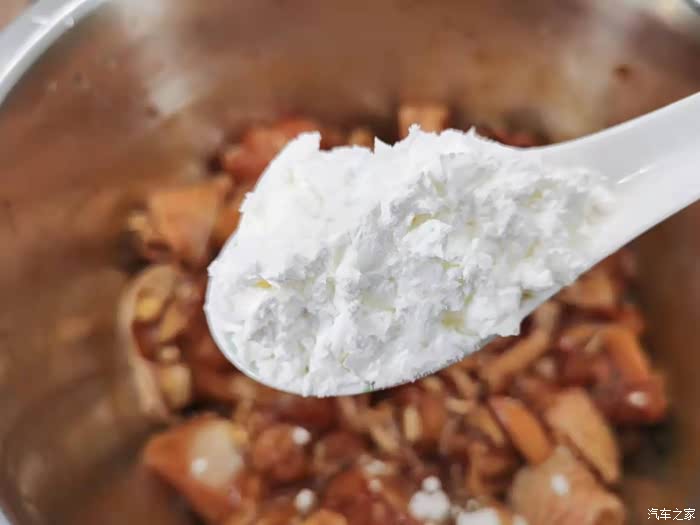 然后加入1大勺淀粉继续抓拌均匀,加入淀粉可以有效地锁住鸡肉的水分不流失,这样处理过的鸡肉吃起来也会更滑嫩。