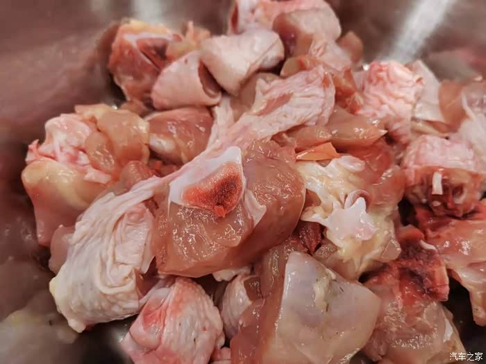 先把鸡腿改刀斩成小块后放大碗中备用,或者把这个步骤交给卖鸡腿的摊主代劳。