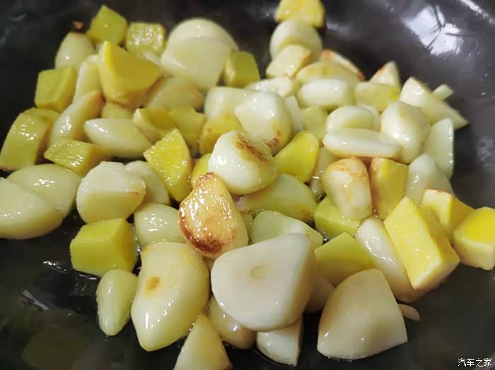 要多翻动,这样锅中的食材才能受热均匀,也不会出现糊锅的现象,一直把蒜子炒到表皮有些金黄,也能闻到蒜香味的时候。