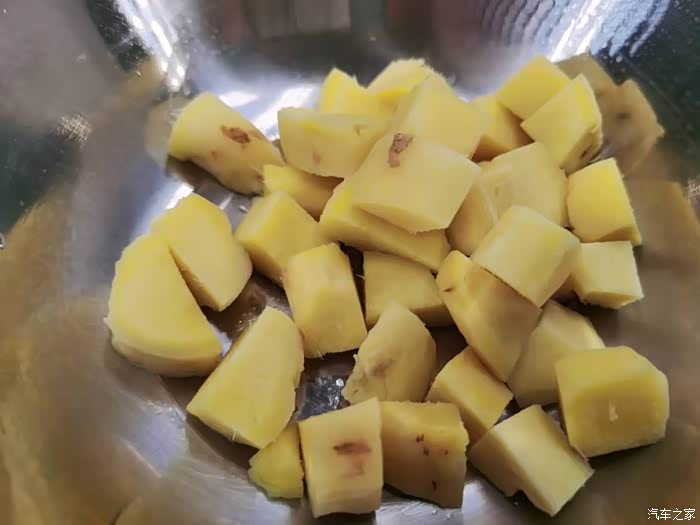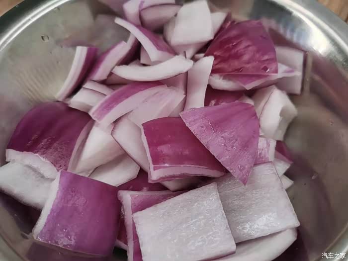 洋葱不用太多,有小半个就可以,把洋葱切成比蒜子更大些的小块备用。洋葱起到的是增香的作用。