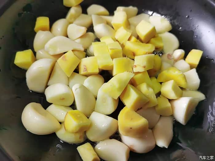生姜先切厚片再切条,最后切成和蒜子大小的颗粒。生姜即可起到很好的去腥作用。