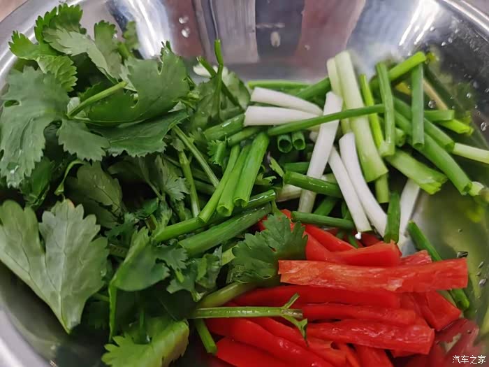 小葱切成3厘米的小段,香菜切成和小葱一样长短的段,红辣椒去头尾去辣椒籽后切成和小葱一样大小的段备用。这三样是最后加进锅里面去的,能起到配色增香的作用。