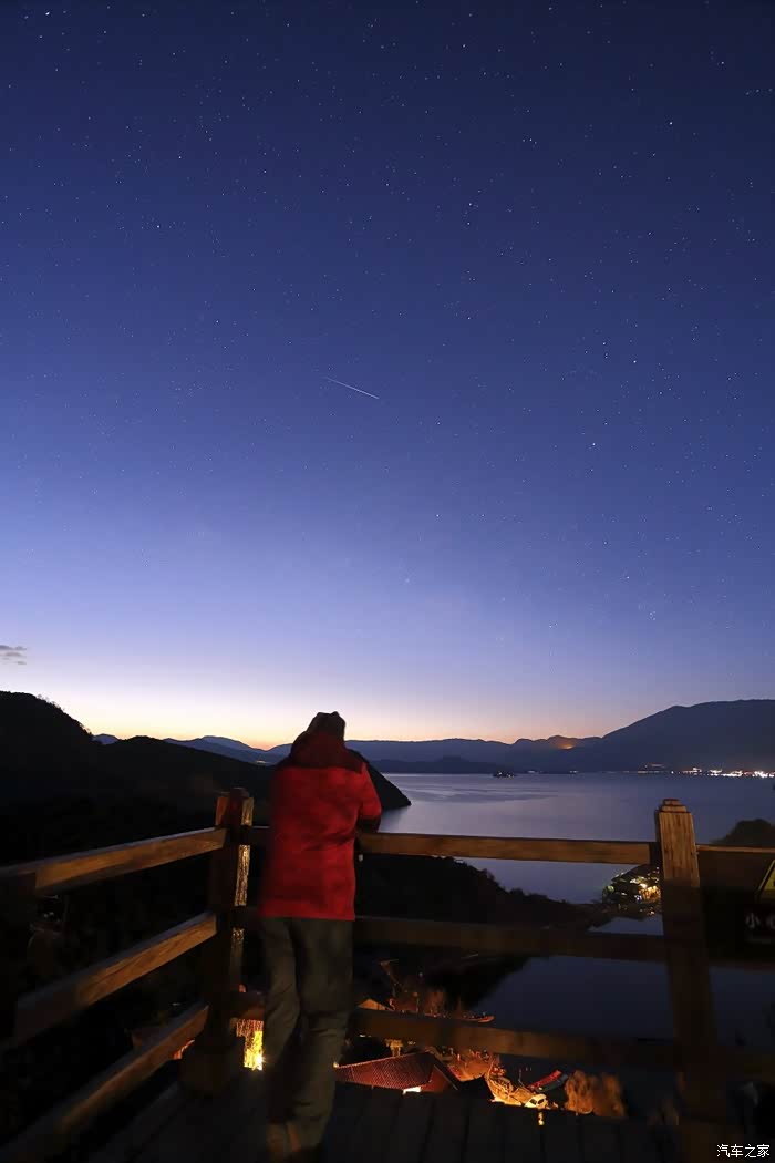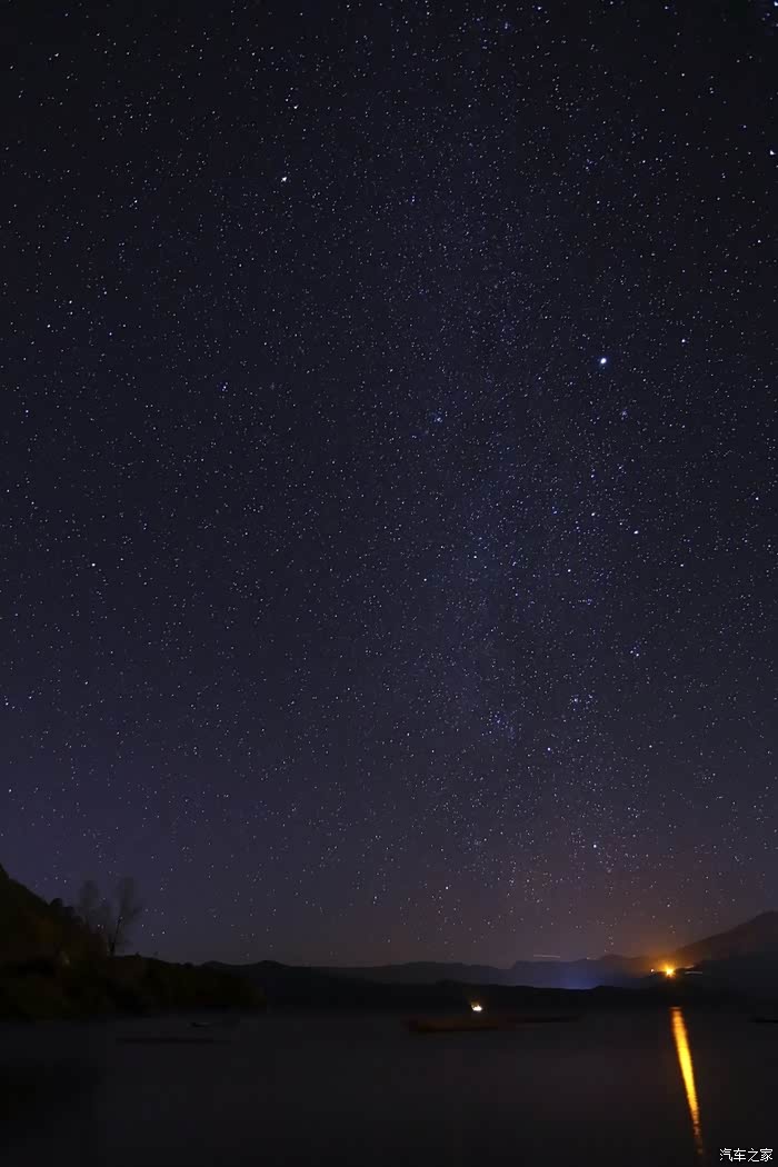 错过日落之后,下车溜达到天色全黑,我们又被迫堵了几十分钟,在八点多钟回到客栈。我看星星已经忽闪忽闪地开始诱惑我了,于是叫上副驾驶一起找了条看起来能走到湖边的路打着电筒扛着相机出门了,结果才走了一半,误入一农户院子,惨遭驱逐并威胁放狗咬人。无奈还是驱车出门,逆时针开到走婚桥,架上相机,啪嚓一拍,星星是可见了,但苦于时辰尚早,对岸商业灯火通明,还是一大片光污染。没办法继续四处寻找拍摄地点,终于在时间渐晚的时候,被我发现了一条人迹罕至的小土路。