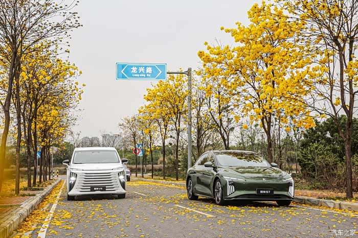 离开东风柳汽展台,我们又去别的地方逛了一会,在一条开满黄花风铃木的街道上,偶遇星海V9、星海S7拍写真,这我就不放自己拍的了,直接放两张摄影师拍的,太帅太好看了!