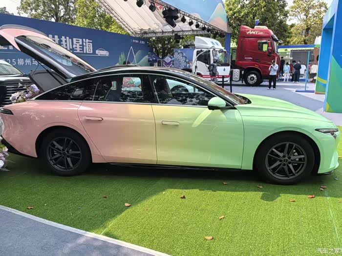 见工作人员都是忙着搭建收尾,我们自己默默观展不做打扰,看到这一排各种颜色的星海S7,老婆眼睛都亮了,尤其是这台紫色的,实车漆面质感是真不错。我跟老婆商量,等增程版上市,我们去试驾看看,合适咱就换增程的,正好今年国补也还在延续嘛。