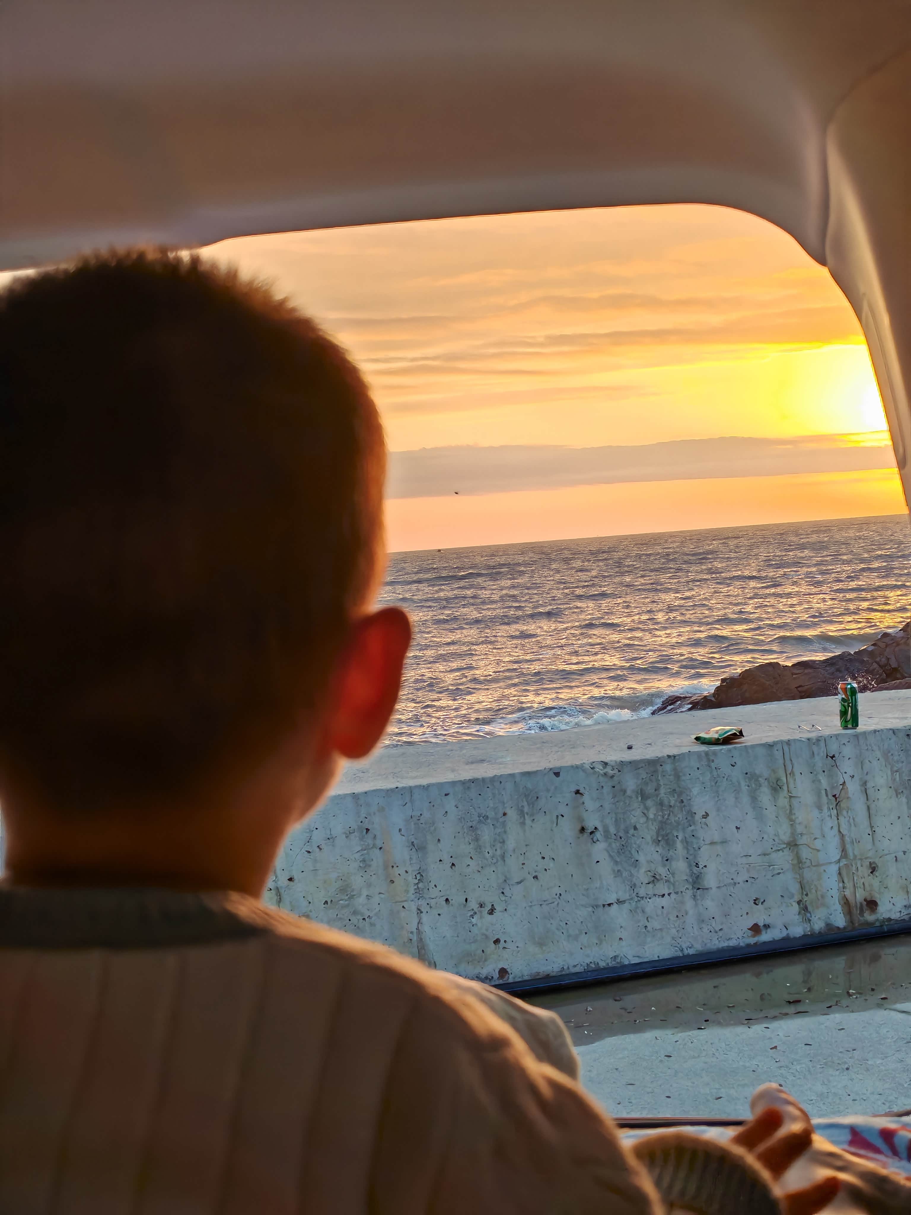 一打开后备箱,看着太阳在海平面上缓缓升起。我儿子都看呆了!