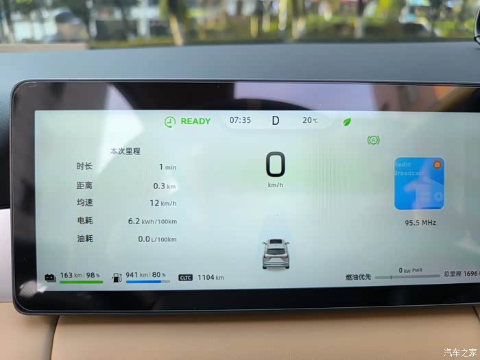 出发时电量还剩98%,cltc标准163公里,燃油80%,cltc标准941公里,经济模式,燃油优先模式,空调自动24°C。