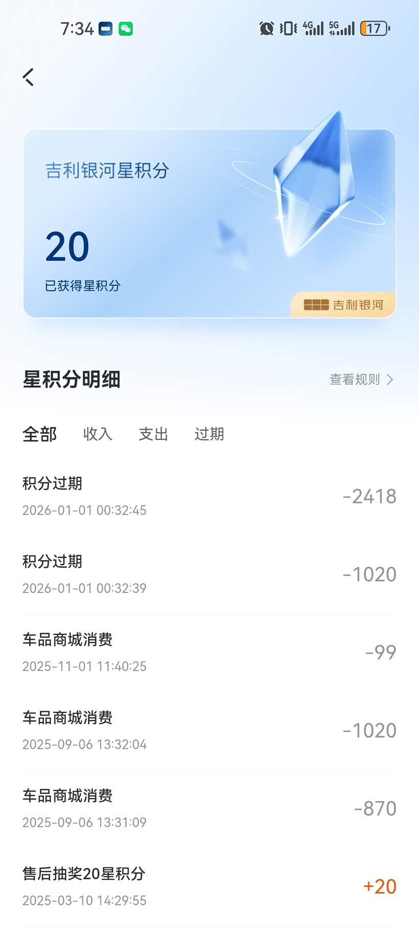 积分过期不提醒,昨天晚上才看到积分被扣除,立马打了电话给400,一点不给处理,买车半个月就降价就算了,2个月就出新版,这都算了,服务各方面都不行,4S掉更是扣,买车时候说的没事来免费充电,买到手半个月就不给充了,本来想想算了的,积分过期打了那么久的电话都不给解决,太气人了,下次换车再也不想换吉利了。