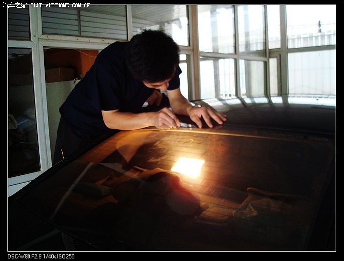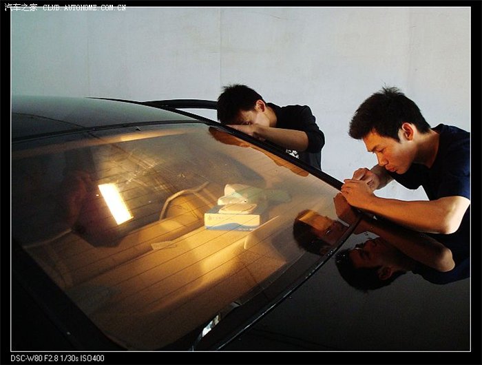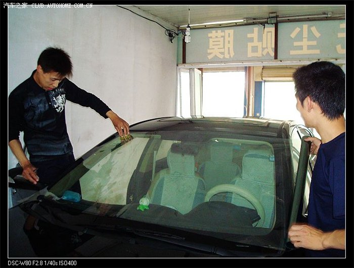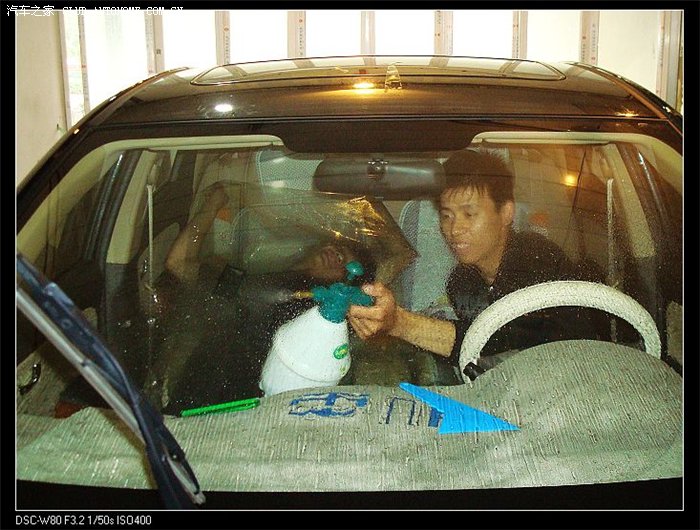 又是一阵狂刮,然后将前档膜贴上,又是一阵狂刮。