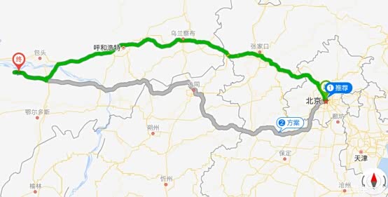 北京到库布齐沙漠路线地图示意