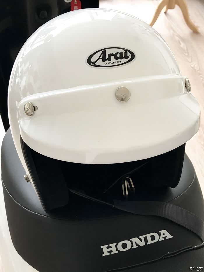 ▲2018 07 22 觉得之前的全盔夏天骑车太热了,并且跟摩托车的外形配色都不搭,于是去日亚上下单了一枚Arai的半盔。选了经典的白色,连国际运费到手大约1200RMB。头盔材质是ABS塑料,和碳纤维的全盔自然是差远啦,但是架不住它好看呀! 而且戴着也很方便,即使装上小帽檐也可以放到坐筒里。