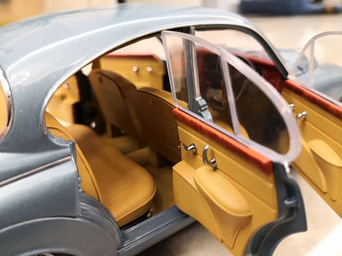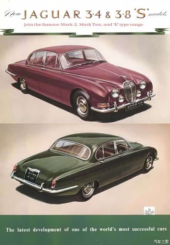 S-Type的设计是以60年代JAG MK2为蓝本,根据现代汽车工业要求进行的。整体造型遵从MK2经典元素,四眼大灯,椭圆形中网,引擎盖曲线,雪茄车身,下压的后备箱,以及圆润的车顶、C柱,甚至前后保险杆上的亮条有两个微微凸起的造型,无不致敬着JAG MK2。为致敬精典,在第5段分享60年代的MK2画报和模型。