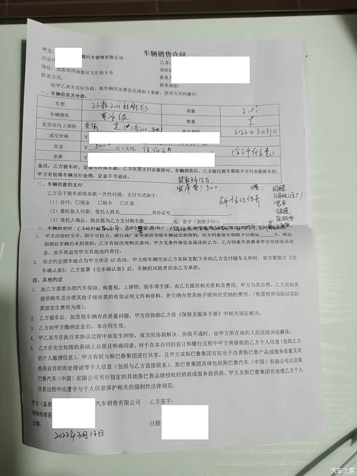 目前车已行驶1500公里(1000公里用车体验将另外发帖),总体感觉是一台很好的车。可能是由于磨合速度始终没超过100公里和新车的原因,感觉噪音没有试驾车大,室内和奥迪差不多,高速胎噪略大,开关车门的砰砰声也很有厚重感,可能是因为的寒冰银颜色颜色和旗舰版18寸轮毂的关系,车身也显得比一般的森林人大。另外,4S店服务也很正规周到,销售也很负责。由于疫情影响,车晚到了半个月,车到后销售及时通知,在我个人的要求下不洗车先验外观,洗车后又内外进行了全面交验,关单在五个工作日内办妥,保险只缴纳了交强、车损、三者200万三个险种。价格吗,由于和4S店谈好的不外传,因此在这里只能告诉大家到目前为止,我在论坛上看的所有优惠都没有我大(含3000元活动券),大家就豁出力气和4S店讲价吧。