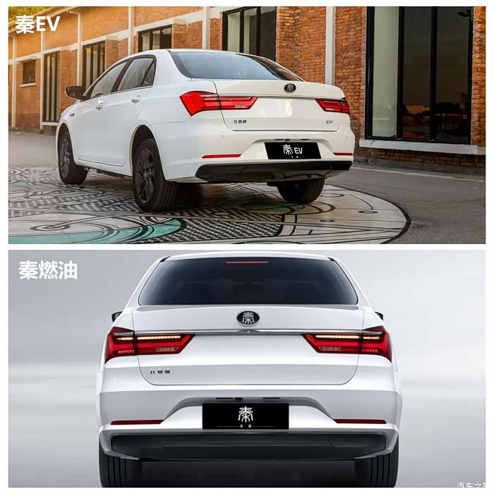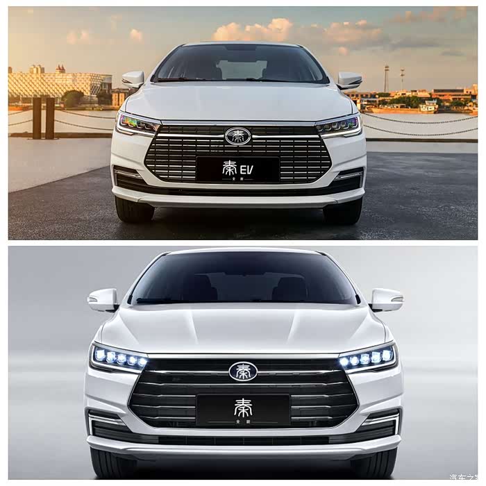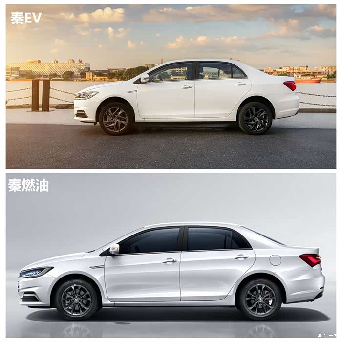 两车前脸、侧面以及尾部造型的对比详见下图,上面是秦EV,下面是秦燃油: