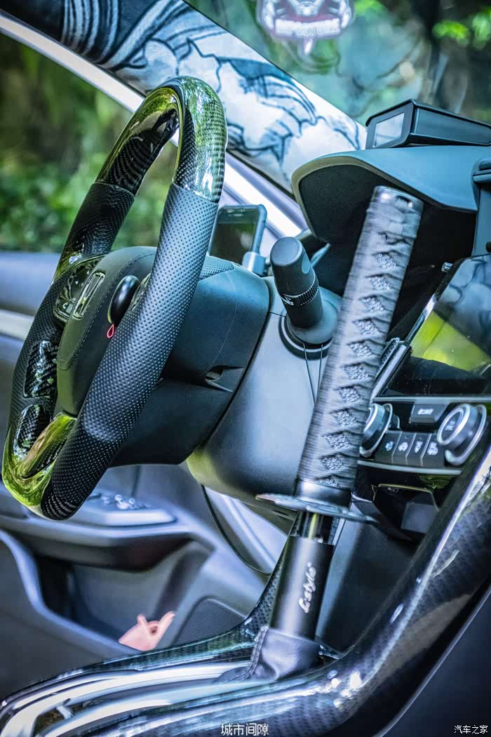 这个炭纤维方向盘有着非常强的运动营造感。、