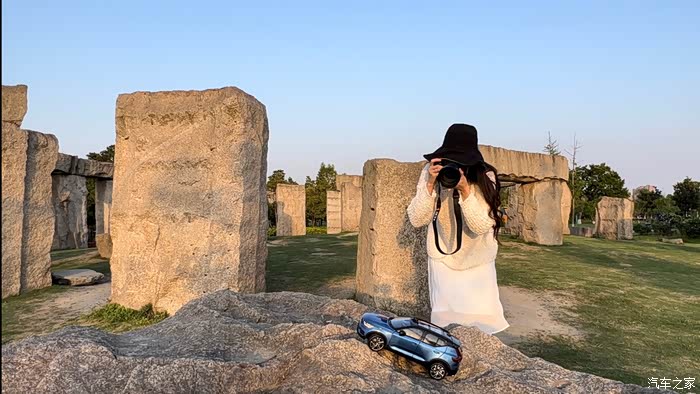 这次我选择在成都市郫都区清水河公园的“巨石阵”拍摄车模,拍完之后,觉得自己这次的拍摄位置没有选错,将车模放在大石头上,其它巨石作为远景,这样的错觉感就会相当强烈: