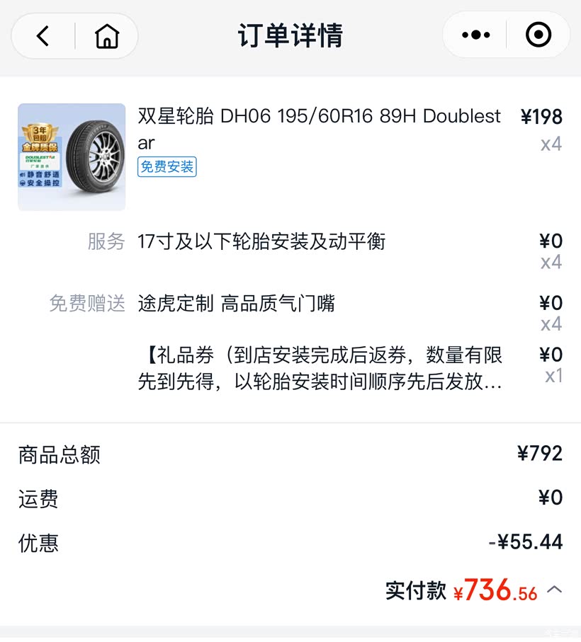 直接上价格,轮胎每条价格371元,因为一直关注轮胎促销打折的信息,知道促销了立马预定了,371元一条包含工时费材料费。总花费1484元