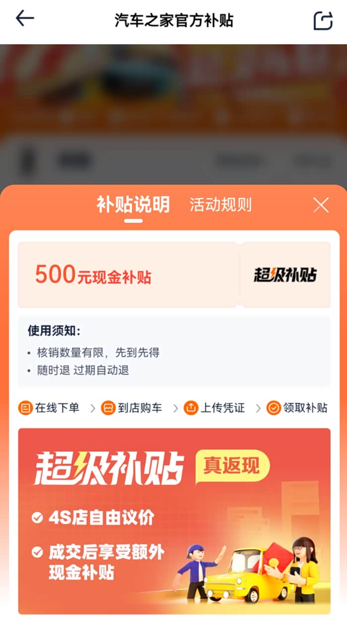 3月购车季,汽车之家推出500元购车现金补贴(注:本活动是汽车之家平台给之家网友的额外购车福利,和4S店无关,不影响您正常到店自由议价和享受其他优惠)