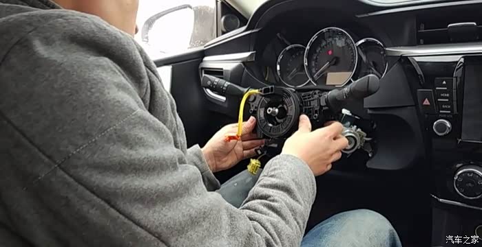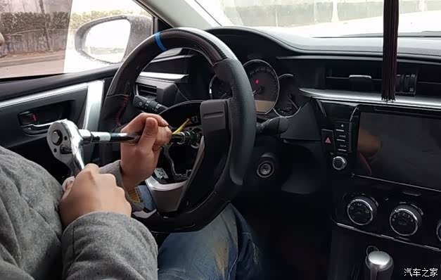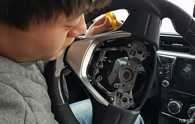 气囊拆下,用19号套筒拆方向盘,一只手扶住方向盘,一只手用力吧螺丝拧松,螺丝卸下来以后,方向盘可能还是拿不下来,往方向盘上左右个来一拳,方向盘就乖乖的下来了。