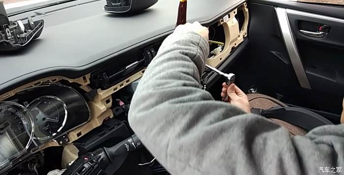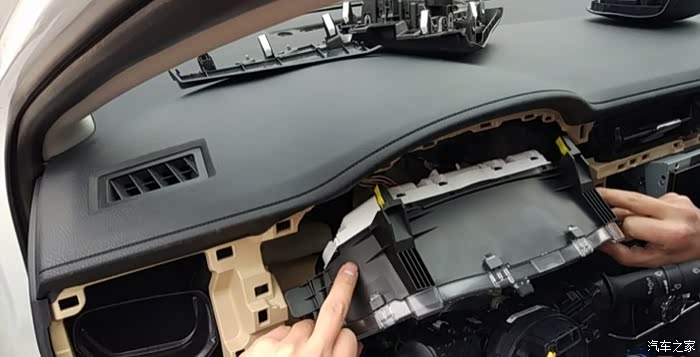 导航拆完了,接着拆仪表,仪表也一样拿撬板撬开左边的空调出风口,在撬仪表上的边框,仪表漏出来以后下边有两个十字螺丝手指的地方,螺丝卸了,往外拉就行。
