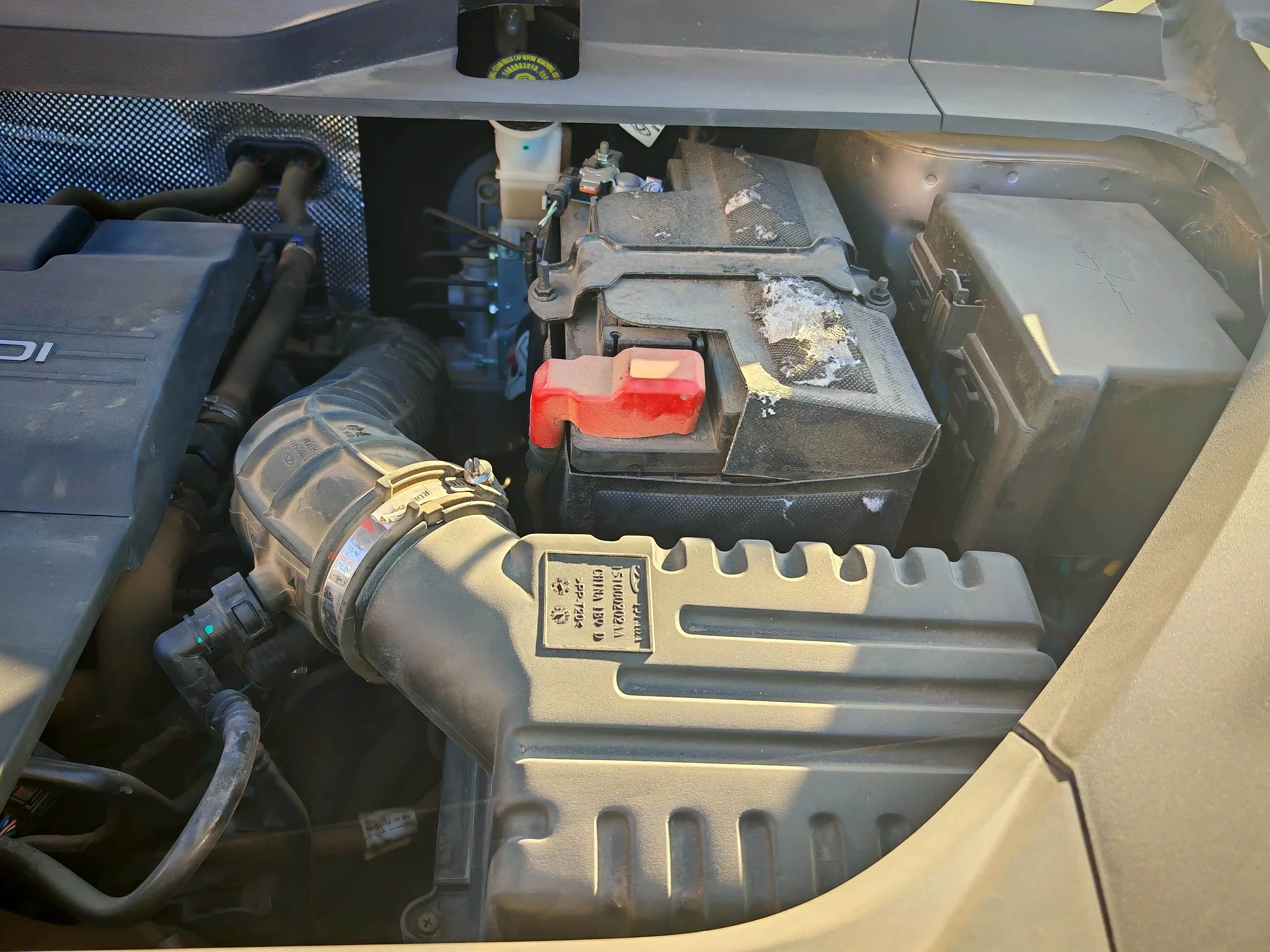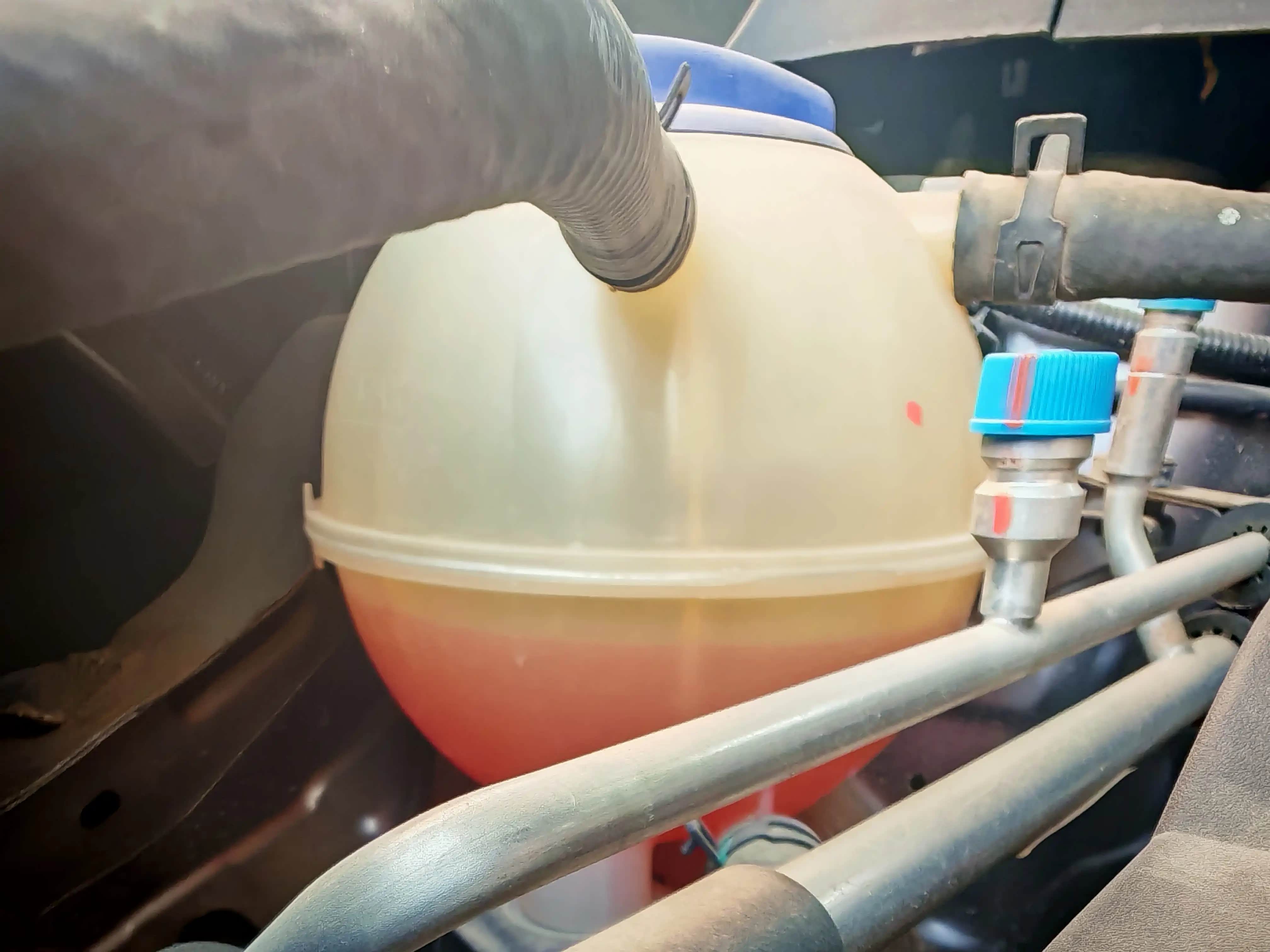 打开发动机盖,能清晰看到刹车油壶和冷却液膨胀壶,冷却液是红色的透明液体,只需观察壶身的刻度线,确保油液位置在最低刻度线以上即可,不足时要补充对应型号的冷却液。