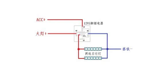 主要接线方法继电器必须要5脚继电器其中85脚接大灯灯光。86脚搭铁。87A脚接保险盒ACC 。30脚接日行灯,87脚空着。下面是简单的接电图