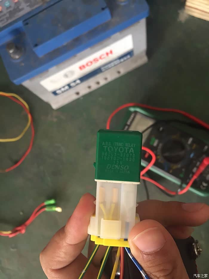 第六步:把日行灯正极线剪断,一分为二,分别连接继电器最上面的那根绿线和继电器上面的红线。