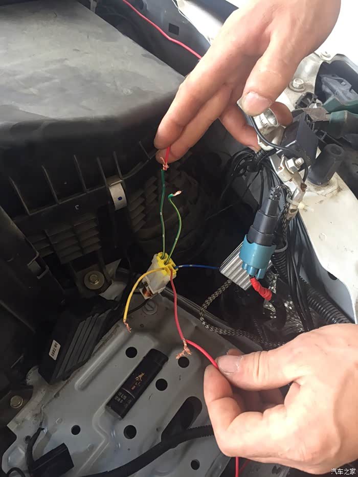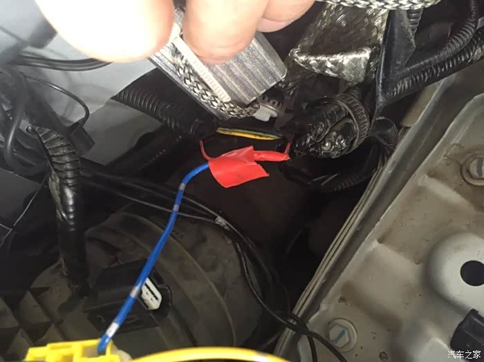 第五步:把继电器的蓝线连接到刚才的红线上,是搭载上,不破坏原车线束结构。