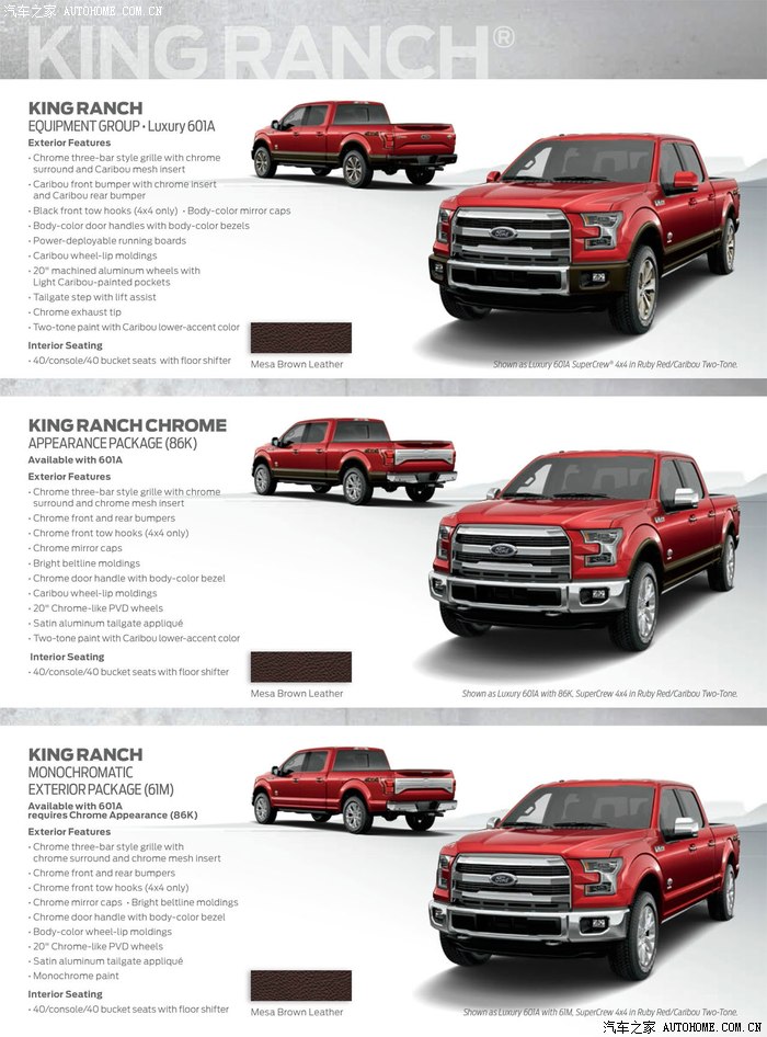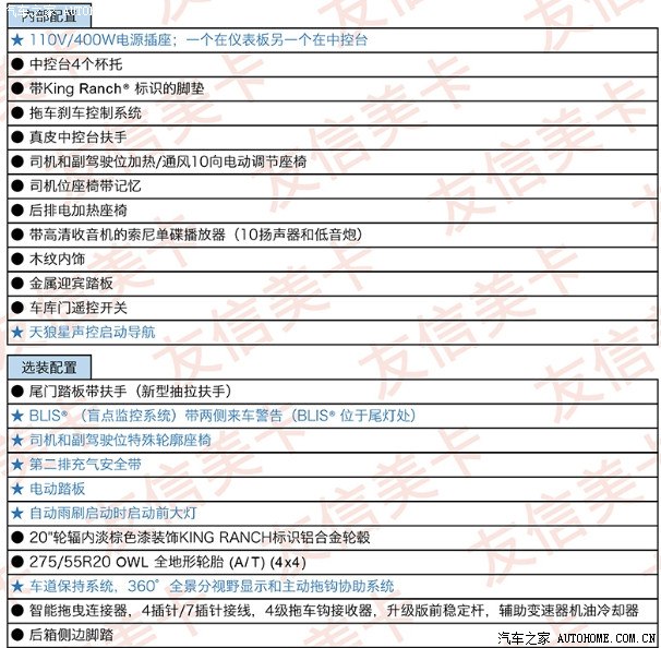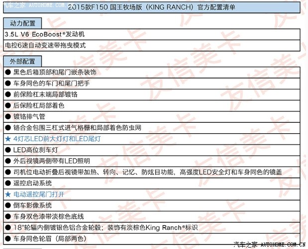 ),由于是全英文而且分类特别复杂,所以我花了好几个通宵把他们细分并且尽量准确的翻译了出来,这个应该算是福利了哦。等实车到国内了(大概在2014年12月或者2015年1月),我会按照配置表逐一的跟实车比对,并且把新增加的功能详细介绍一遍,这项工作将是几个月以后的事了。总结一下这篇帖子的重点:【第一项】是用照片把不同版本的2015款F150车型给归类,让还对福特皮卡系列车型不够了解的人能够一目了然,对的上号。【第二项】是把不同版本的配置清单作为福利第一时间发给大家。【第三项】是等实车到了国内,第一时间做现场测评(动态和静态),把新增加的颠覆性的配置逐一比对,更直观的让大家欣赏到全球最先进的皮卡。在整个过程中,如果有朋友遇到什么问题和话题,我会穿插着给做解答和介绍。