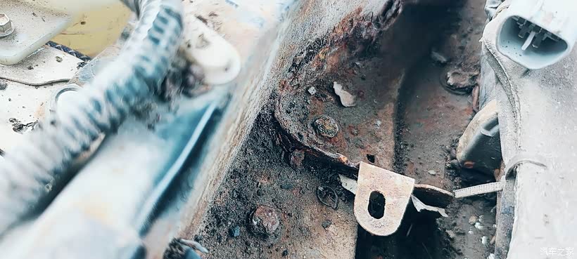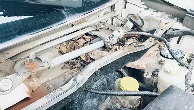 排水槽左右两侧分别被树叶和泥巴堵住水道,下雨容易排不出去产生积水锈蚀螺丝及周边附件。红圈位置我拆开水槽发现水道被彻底堵死,建议老车都清理一下