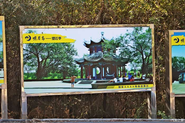 每一块宣传板上都有详细的景观图片,从图片中我们可以看到照片是夏天拍摄的,牌楼可谓是明月岛中的标致性建筑了,周围的花朵花团锦簇,花朵儿也是颜色各异,黄色、红色、蓝色等等数不尽的花朵让人驻足观赏。在望江亭景观内,更是热闹。很多游客都聚集在望江亭的周围乘凉、观景,一片有说有笑的“风景”。同时望江亭内可以观赏到嫩江的魅力景色,绝对会让许多游客陶醉在这里。