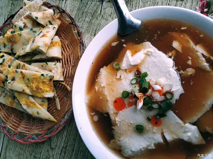 今天天气晴,我开着爱车宝来去实现计划了好久的自驾游,目的地是河北省石家庄市平山县的沕沕水景区,出发前先吃早餐,我要了一份韭菜鸡蛋饼,配上一碗豆腐脑,洁白碧玉的豆腐脑配上灵魂的卤汤,在点缀上翠绿的小葱花,这种食欲感的冲击使我不禁的咽口水。
