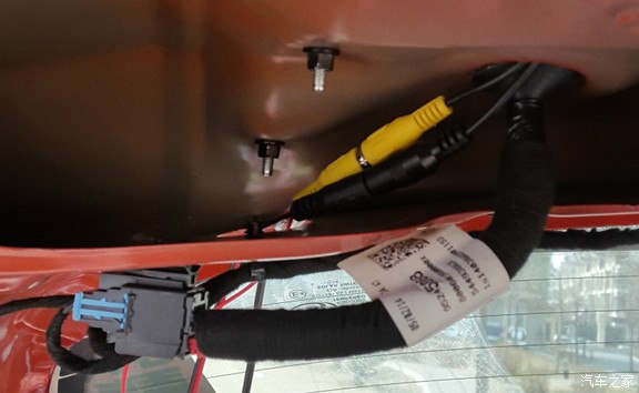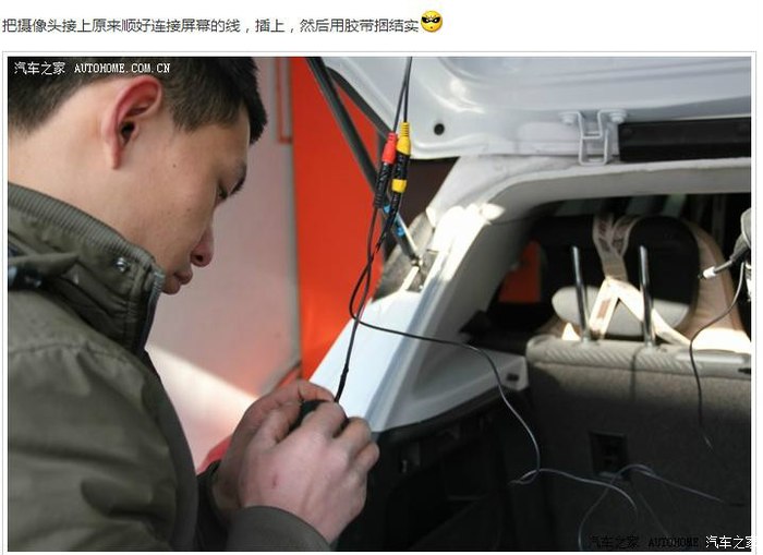 前面有点没交代清楚,后摄像头有两个接头一个是视频线,黄色那个,一个是电源线,电源线分红黑两根,红色是正极接倒车灯线,黑色接地,厂家说黑色可以不接我就没接,用胶带封好,下面看接倒车灯供电线了,我的红线不够长,后接的一根黄绿线,请大家注意,