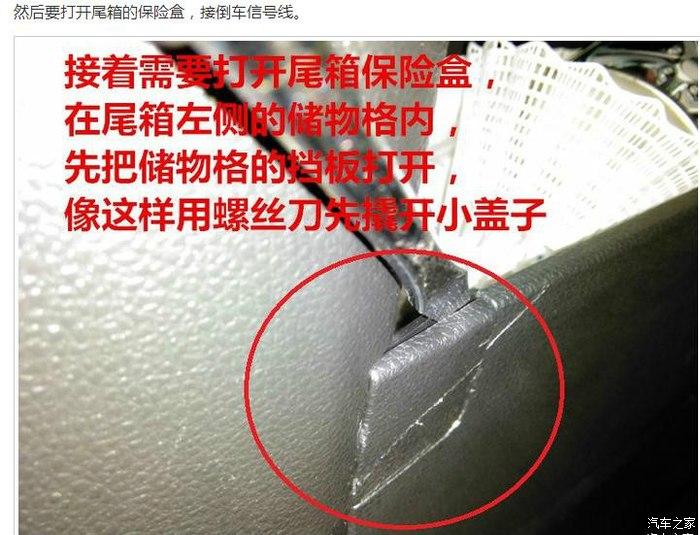 这里缺一张照片,把显示器的线通过仪表台左侧的护板穿到保险盒内,把护板撬开,挺费力,撬就行都是金属卡子,打开保险盒的图片如下