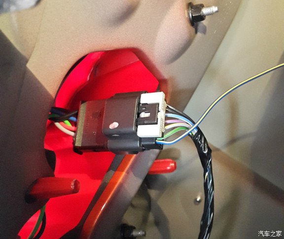 这里caruser2013同学把线剥开了,我的做法是把摄像头线插到线束接头里面,本来想把这根线的插接金属头挑出来,但是实在不行,放弃了直接插里面如下图