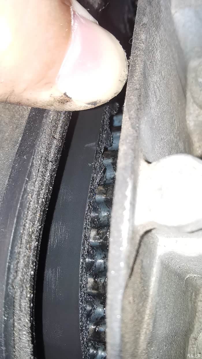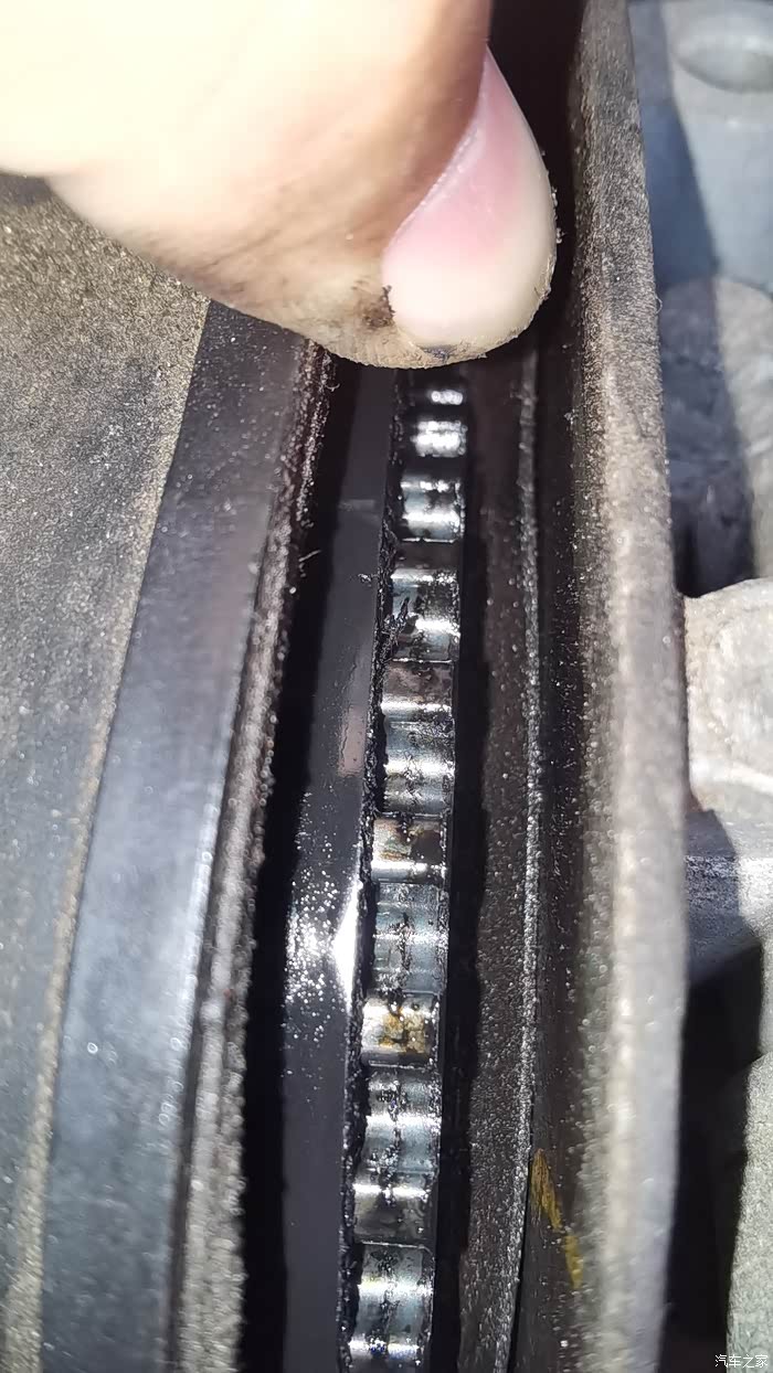 如题,如图,21.5万公里2014年1月车,正时皮带盖子掰开瞄了一下,皮带上面湿漉漉的,还有点裂纹了(图5),大抵又该换了。