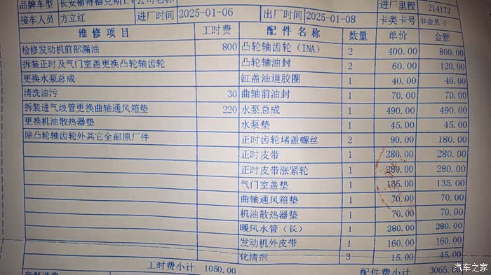 前天送车去专修福特马自达一店家,检查一下,没开时规盖,看到一堆油迹就断定VVT轮漏油了,曲轴前油封是上周换机脚胶时发现漏油了。然后我计划换的正时皮带,水泵。再检查一下发现发动机左侧也是曲轴通风箱哪哪漏油,一并处理吧,换垫片。嗯嗯,开了一页纸的单,4000蚊
