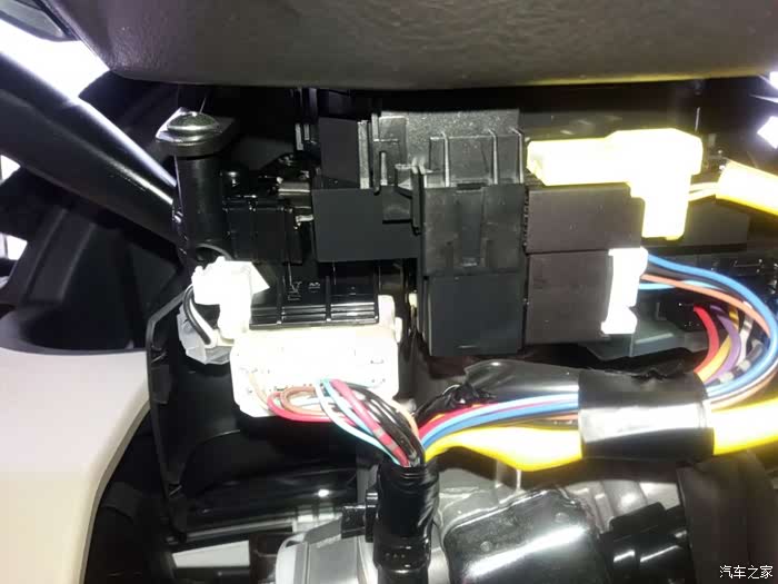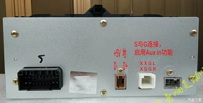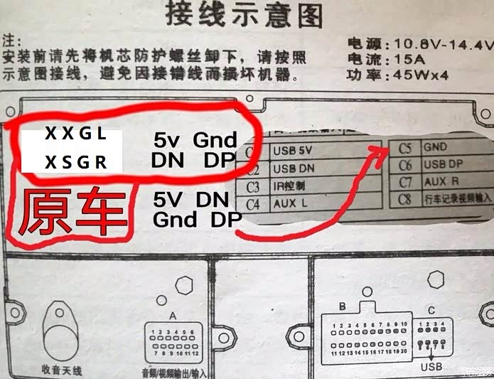 如图,如果你的导航一体机也是图中这样,就要继续看了。C口是集成USB和AUX在一起的,而原车是分在两个电缆里的。按顺序排下来,就是我红圈画的样子,原车的USB在4芯里,而8芯里是AUX,可导航一体机,只有这个8芯口如果直接插上,相当于USB没插。。。而且就算插了,线序也不一样,红框下面是与一体机USB部分的对比,