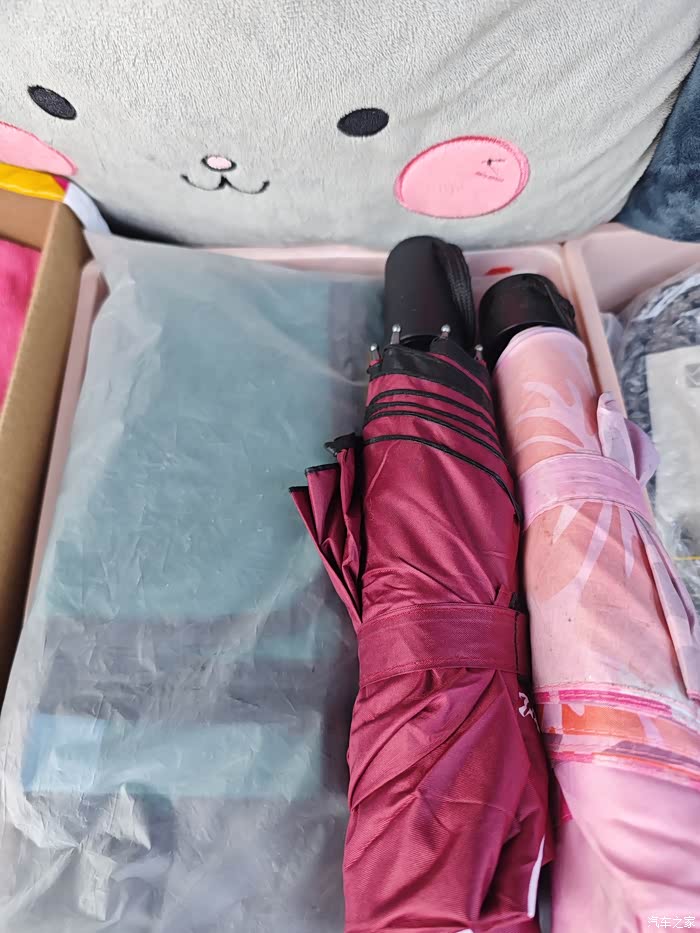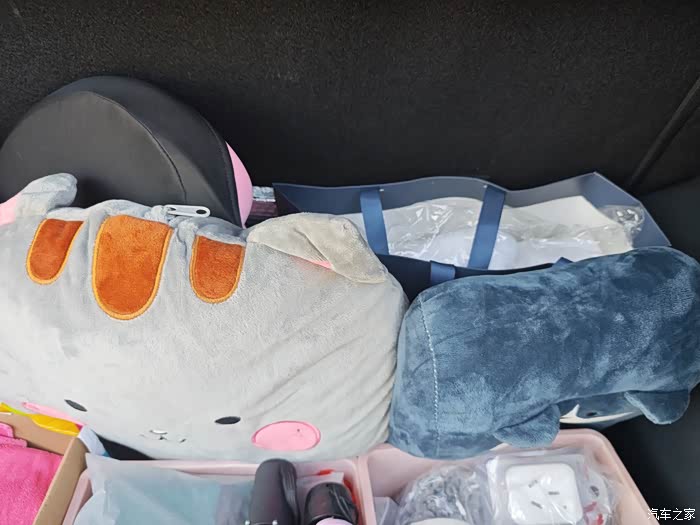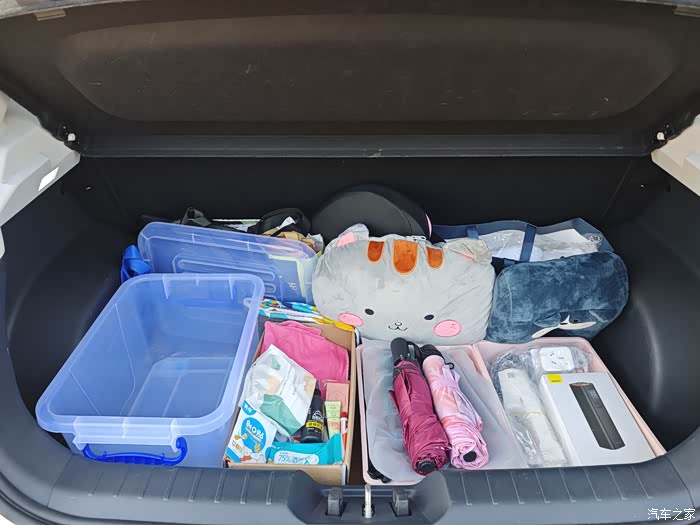 关于后备箱的日常收纳和空间利用,我最大的心得就是一定要铺满整个平面,这样不管是急刹车还是走山路弯路,都不会来回移动,防止高的大件物品倾斜侧倒。平时车大都是用来通勤、逛街购物,所以后备箱就是我的“移动小仓库”,用不同规格和高度的收纳箱 分区存放零碎物品,比如雨伞、备用运动鞋、购物袋、洗车用品等等。然后,机智的我把剩余空间用折叠抱枕和头枕填满了,这样不会造成前后晃动,平常如果跑长途可以展开来当枕头和被子,特别舒适。