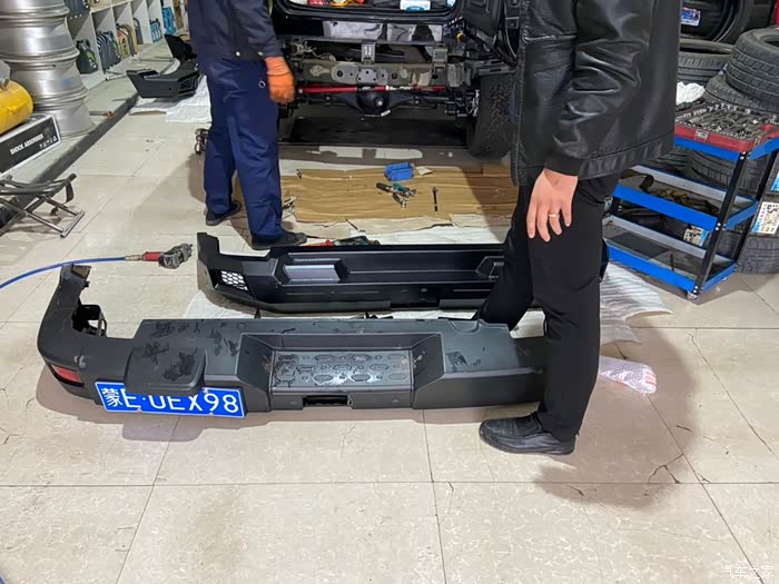 先拆后杠,原厂杠很轻,就是防护性能差了点,拆完以后是不是瞬间感觉这离去角无敌了哈哈!就是有点丑!后杠还是很好搞定的螺丝没几个好拆也好安装!我这个锰钢的杠都是原厂孔位,所以安装起来也不麻烦很简单就搞定了!