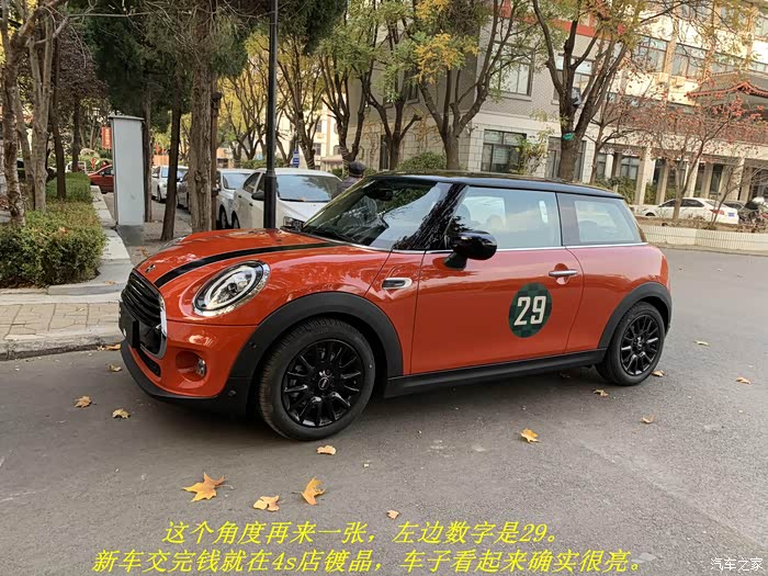 等车的过程是痛苦的,没事就去论坛看大家的提车帖,越看越喜欢,越看越着急。终于,10月31日到港,一周时间过海关,然后三四天左右就到了4s店,销售说再等两三天关单到了之后就可以提车了。周天,迫不及待的去办手续:交尾款、买保险、然后新车镀晶。第二天早晨去4s店开着车去车管所办理新车上线、交纳购置税、选车牌、邮寄等手续。还算顺利,这一切结束之后立刻去朋友店里贴上拉花以及圆形数字贴。到此,我的mini才算成为了完成体。