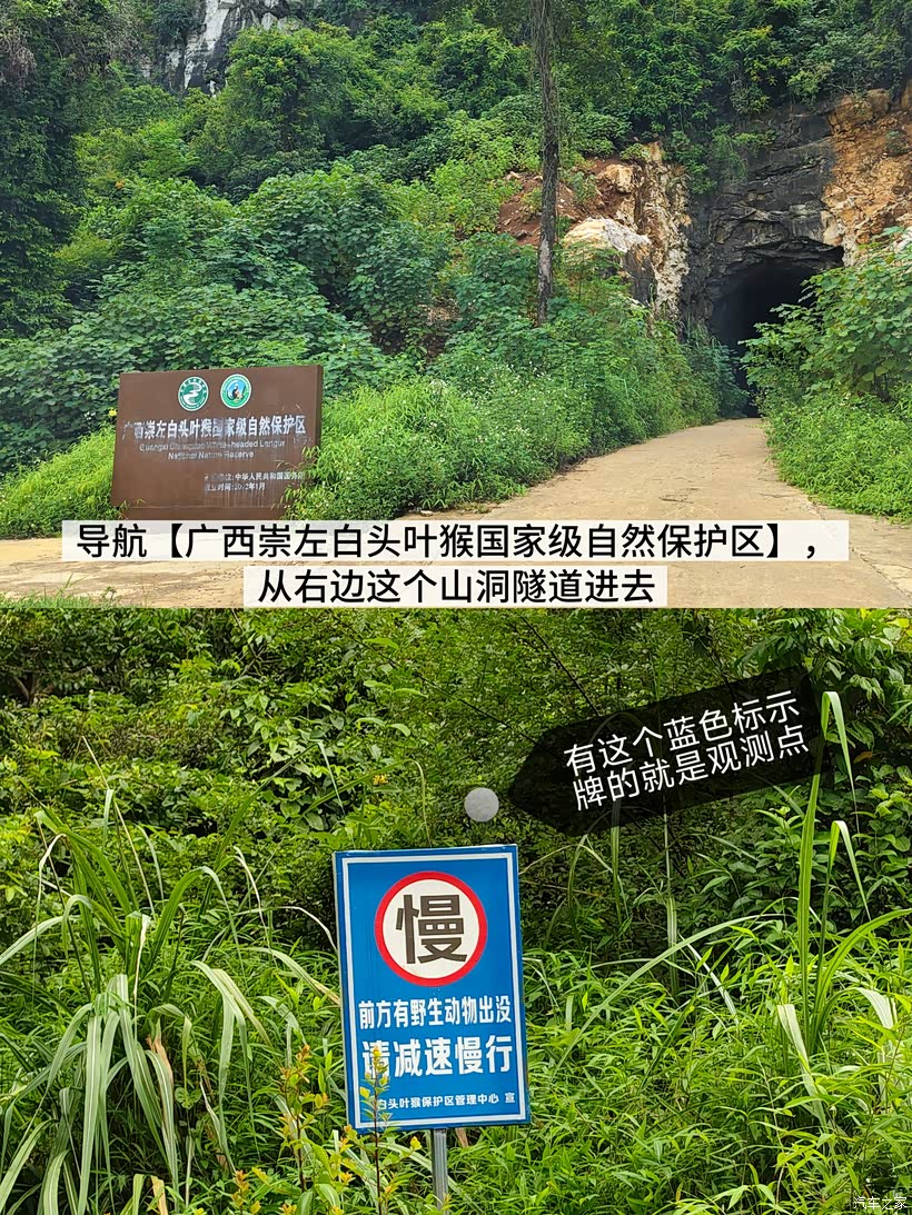 到达导航点会看到【广西崇左白头叶猴国家级自然保护区】石碑牌子,从右边山洞隧道穿过,再继续往里开一公里左右到,有蓝色提示牌的就是观测点(注有:野生动物出没)