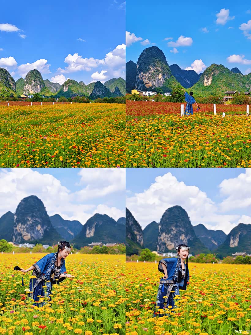 【旧州景区】是本次出片率最高的景点了,真的超美!远处喀斯特山峰如黛,小桥流水,稻田绵延,花海盛开,仿佛闯进了山水画里!