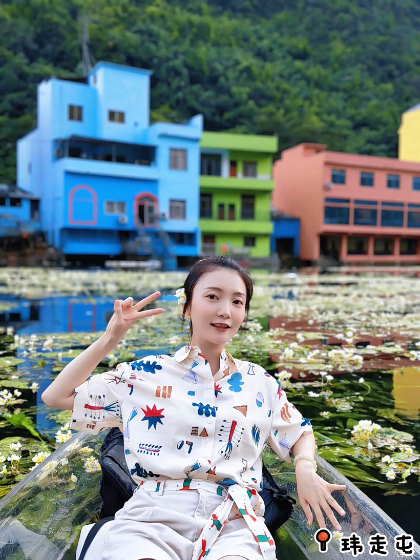 “会开花的河” 秘境,花海核心区,盛花期花开铺满水面超美!如果是女生,一定要租一艘玻璃船,划到花海中间去拍照真的绝绝子!推荐下午四点左右过去,阳光柔和拍照更好看,五点半左右太阳就被山挡住了。如果开车可以停村口桥边旁边那排没开业的店铺门口,没人在那边收停车费。